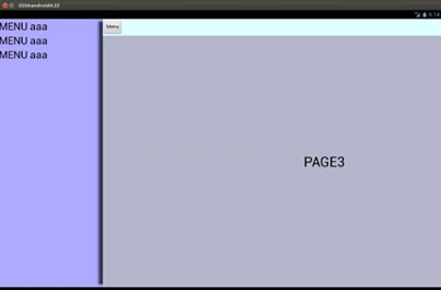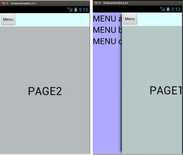右上图:具有滑动菜单的容器,组合了左图的功能,点击Menu按钮可以打开/关闭菜单,也可以通过手指滑动Menu所在的标题栏来实现菜单的打开/关闭