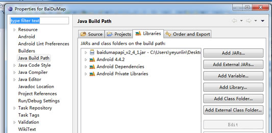 然后将baidumapapi_v2_4_1.jar文件放在项目libs文件夹下,并在libs下新建文件夹armeabi,将libBaiduMapSDK_v2_4_1.so文件放在armeabi文件夹下,并导入jar包: