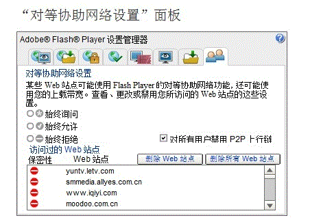 2,进入Adobe Flash设置管理器 “对等协助网络设置”面板 进行设置: