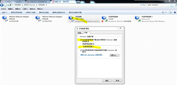 2,选择左边选项里的”更改适配器设置“->右键点击”本地连接“-> 属性 -> 共享 -> 勾选”允许其他用户………“ ->确定。。如下图: