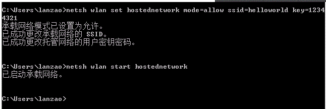 ”netsh wlan set hostednetwork mode=allow ssid=xxxxxxx key=12345678