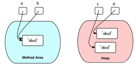 这里 a == b 为 true,是因为 a 和 b 都引用了方法区的同一个字符串字面值。在java中,当同一个字符串字面值出现多次时,在内存中只会保存该字符串的一份拷贝,即 a 指向的 "abcd" 跟 b 指向的 "abcd" 在内存中是同一个对象。这种方法叫做 "字符串驻留(string interning)"。